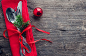 Zdjęcie "Nakrycie stołu do uroczystości Bożego Narodzenia i nowego roku wakacje na biały drewniany stół... Świąteczne nakrycie na świąteczny obiad z czerwony serwetka i naturalnymi dekoracjami. Widok z góry. Miejsce." może być wykorzystywane do celów osobistych i komercyjnych zgodnie z warunkami zakupionej licencji Royalty-free. Obraz jest dostępny do pobrania w jakości wysokiej rozdzielczości do 5760x3840.