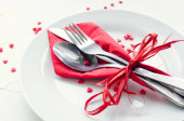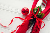 Nakrycie stołu do uroczystości Bożego Narodzenia i nowego roku wakacje na biały drewniany stół... Świąteczne nakrycie na świąteczny obiad z czerwony serwetka i naturalnymi dekoracjami. Widok z góry. Miejsce.
