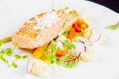 Pieczony łosoś, buraki MUS, czarna soczewica i gruszka na białym tle