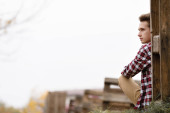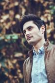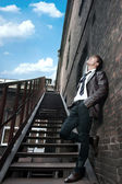 przystojny mężczyzna z nowoczesną fryzurę uśmiechający się w ośrodkach miejskich