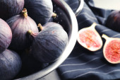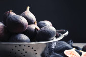 Durszlak z świeżych dojrzałych fig na stole, zbliżenie. Owoce tropikalne