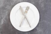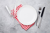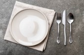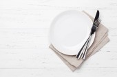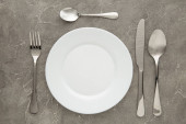 Nakrycie stołu. Pusta płyta, nóż, widelec i łyżki. Widok z góry i położyć płasko z kopia miejsce