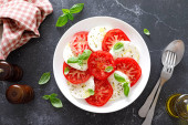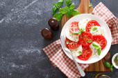 Sałatka z pomidorów. Sałatką ze świeżych warzyw z pomidorów, cebuli i bazylii