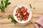 Sałatka z pomidorów. Sałatką ze świeżych warzyw z pomidorów, cebuli i bazylii