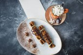 Deser czekoladowy z cynamonu, anyżu i filiżankę kawy z pianką. Smaczny deser i kawa napój