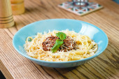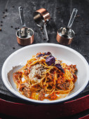 makaron bolognese w płytkę, sól i pieprz, szkło musujące wytrawne wino na stole