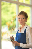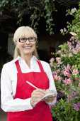 portret szczęśliwy kwiaciarni starszy, robić notatki w szklarni