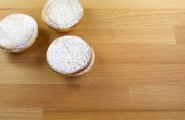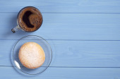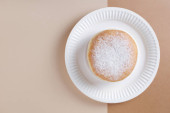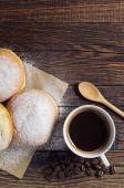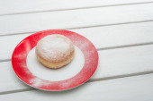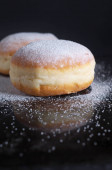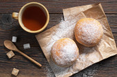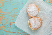 Berliner pączki z dżemem i cukier puder w płycie drewnianym widelcem i nożem na starą tabela, widok z góry