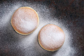 Zdjęcie "Berliner pączki z dżemem i cukier puder w płycie drewnianym widelcem i nożem na starą tabela, widok z góry" może być wykorzystywane do celów osobistych i komercyjnych zgodnie z warunkami zakupionej licencji Royalty-free. Obraz jest dostępny do pobrania w jakości wysokiej rozdzielczości do 5760x3840.