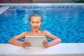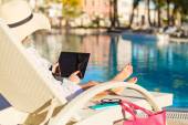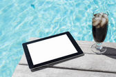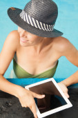 Kobieta przy użyciu komputera typu tablet, siedząc przy basenie