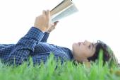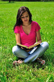 widok z tyłu indyjskich dziewczyna czytając książkę w parku.
