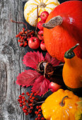 Jesień karta Martwa natura z dyni, jabłka, gruszki i kolorowe liście na drewnianym stole. Widok z góry i leżał płaski