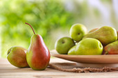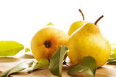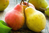 Dojrzałych gruszek na drewnianym stole. Zdrowe przekąski