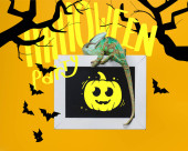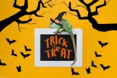 piękne egzotyczne kameleon na tablica z napisem "wee bit wicked" i nietoperze żółty