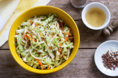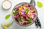 Surówka z białej kapusty z kapusty, marchewki i różnych ziół, serwowane z tortilli i guacamala na podłoże drewniane.