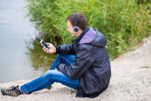 Piękna młoda kobieta stoi w parku jesienią i przy użyciu telefonu komórkowego