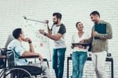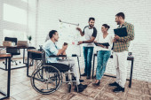 Młodych menedżerów na relaksujący wypoczynek w nowoczesnym biurze. Uśmiecha się kobieta. Człowiek na wózku inwalidzkim. Uśmiechający się pracownika. Komunikacja z kolegami. Zabawa w biurze. Koncepcja pracy zespołowej. Relaks w pracy.