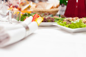 Zdjęcie "Służył do stołu bankietowego. Szklanki do wina z serwetkami, szklankami i sałatkami." może być wykorzystywane do celów osobistych i komercyjnych zgodnie z warunkami zakupionej licencji Royalty-free. Obraz jest dostępny do pobrania w jakości wysokiej rozdzielczości do 5760x3840.