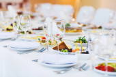 Służył do stołu bankietowego. Szklanki do wina z serwetkami, szklankami i sałatkami.