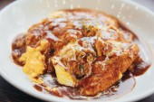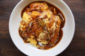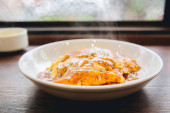 Ryż z curry z omlet Japoński styl drewna tło filmu stylu vintage