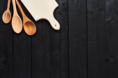 Górnej części drewniane łyżki i ścierki na czarnym tle drewnianych z miejsca kopii. Widok z góry przyborów kuchennych na ciemnym tle drewnianych. Leżał z płaskim.