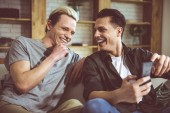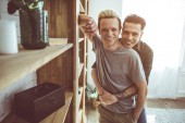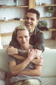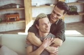Młody człowiek blond przytulanie jego chłopaka w domu