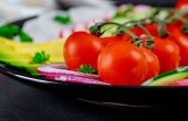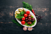 Talerz pokrojone świeże warzywa. Sałatka. Na stare drewniane tła. Ilość wolnego miejsca dla tekstu. Widok z góry.