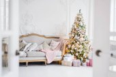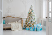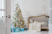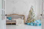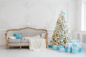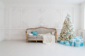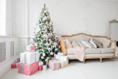 Stylowe wnętrze świąteczne z elegancką sofą. Dom pocieszenia. Prezenty pod drzewem w salonie
