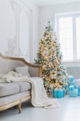 Boże Narodzenie lub nowy rok dekoracji w salonie wnętrza i wystrój domu wakacyjnego koncepcja. Spokojny obraz koca na kanapie vintage z drzewa, Å ¼ ycia, prezenty. Skupienie selektywne