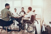 Osoba na wózku inwalidzkim. Grupa niepełnosprawnych pracowników. Panoramiczny widok. Białe wnętrze. Ludzie z ograniczonych możliwości. Spotkanie biznesowe. Ubrania firmy. Garnitury biznesowe. Proces pracy. Człowiek na wózku inwalidzkim.
