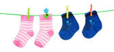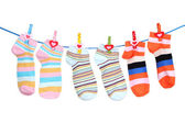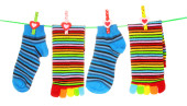 kolorowe skarpetki wiszące na bielizny, na białym tle