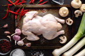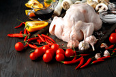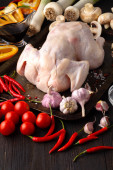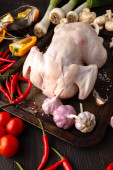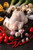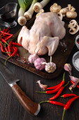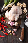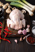 Surowe niegotowane kurczaka, podudzia na desce, mięso z składniki do gotowania