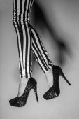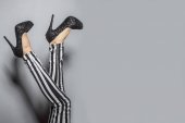 Kobieta nogi sobie pasiaste spodnie i wysokie obcasy