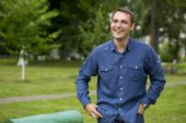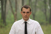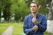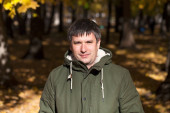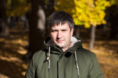 Portret młodego człowieka na tle park jesień z bliska
