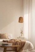 Zdjęcie "Drewniane drzwi i lampy w sypialni białe wnętrze z koc na łóżku i kwiaty na stole. Prawdziwe zdjęcie" może być wykorzystywane do celów osobistych i komercyjnych zgodnie z warunkami zakupionej licencji Royalty-free. Obraz jest dostępny do pobrania w jakości wysokiej rozdzielczości do 5760x3840.