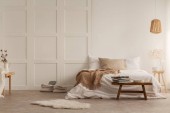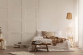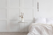 Drewniane drzwi i lampy w sypialni białe wnętrze z koc na łóżku i kwiaty na stole. Prawdziwe zdjęcie