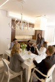 Grupa młodych ludzi szuka dobry razem stojący na tle ściany i za pomocą telefonu komórkowego