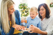 Zdjęcie "Mały chłopiec z teraźniejszości i matka i babcia, w domu w czasie świąt Bożego Narodzenia." może być wykorzystywane do celów osobistych i komercyjnych zgodnie z warunkami zakupionej licencji Royalty-free. Obraz jest dostępny do pobrania w jakości wysokiej rozdzielczości do 5760x3840.