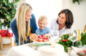 Mały chłopiec z teraźniejszości i matka i babcia, w domu w czasie świąt Bożego Narodzenia.