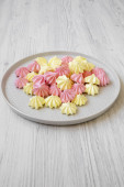 Zdjęcie "Mini Bezy na szare płytki nad białym tle drewnianych, widok z boku. Zbliżenie." może być wykorzystywane do celów osobistych i komercyjnych zgodnie z warunkami zakupionej licencji Royalty-free. Obraz jest dostępny do pobrania w jakości wysokiej rozdzielczości do 5760x3840.