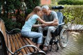 Inwalidów, patrząc na siebie nawzajem. Hali lotniska. Kobieta na wózku inwalidzkim. Pokój z widokiem na okolicę. Ograniczone możliwości. Romantyczne spotkanie osób niepełnosprawnych. Kochający niepełnosprawnych. Ludzie z ograniczonych możliwości.