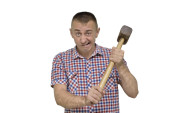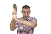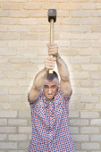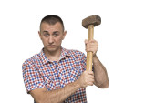 Mężczyzna niezadowolony z młotem na białym tle. Koncepcja pracy. Izolowanie