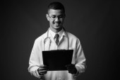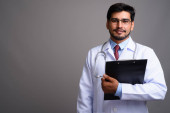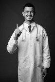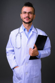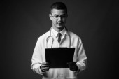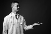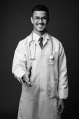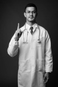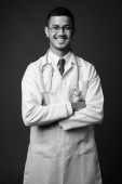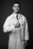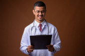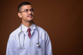 Młody człowiek Asian wieloetnicznego lekarz na brązowym tle