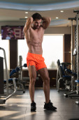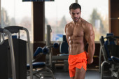 Przystojny Młody Człowiek Stojący Silny W Siłowni i Flexing Muscles - Muscular Athletic Bodybuilder Fitness Model Pozowanie Po Ćwiczeniach