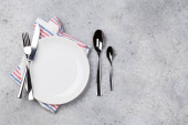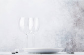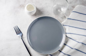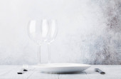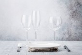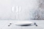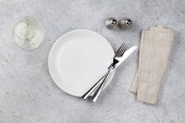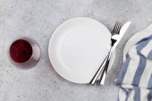 Nakrycie stołu. Pusta płyta, nóż, widelec, kieliszek do wina i serwetka. Widok z góry i położyć płasko z kopia miejsce