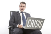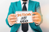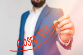 Zdjęcie "Młody atrakcyjny człowiek w niebieskim garniturze gospodarstwa znak biały z czerwonym napisem zamknięte na szarym tle. Stonowanych" może być wykorzystywane do celów osobistych i komercyjnych zgodnie z warunkami zakupionej licencji Royalty-free. Obraz jest dostępny do pobrania w jakości wysokiej rozdzielczości do 5760x3840.