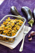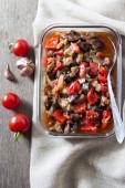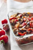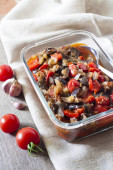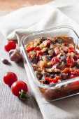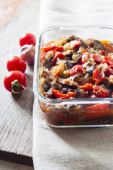 Gulasz z bakłażanem, czerwona papryka i pomidory w szklanej misce