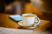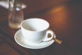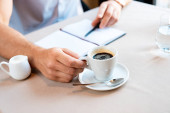 filiżankę kawy z łyżeczką i otwieramy notatnikiem piórem na drewnianym stole w kawiarni