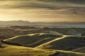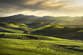 Toskania, wiejskiego krajobrazu na zachód słońca, Włochy. jezioro i zielone pola