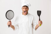 Zdjęcie "Obraz człowieka przystojny młody kucharz na białym tle białej ściany wyświetlone kciuki Gos." może być wykorzystywane do celów osobistych i komercyjnych zgodnie z warunkami zakupionej licencji Royalty-free. Obraz jest dostępny do pobrania w jakości wysokiej rozdzielczości do 5760x3840.